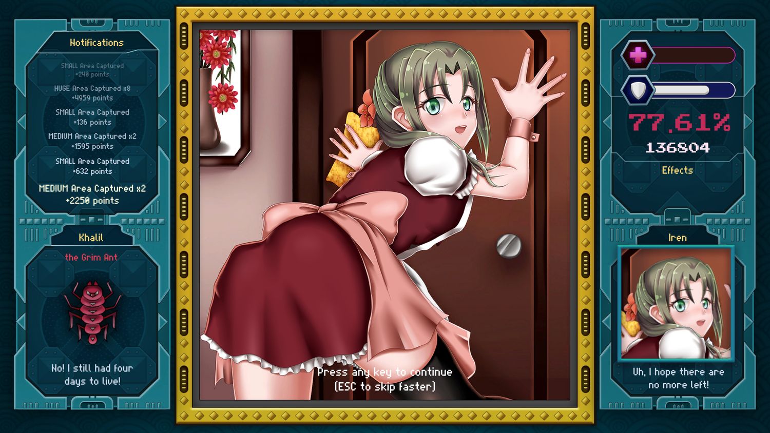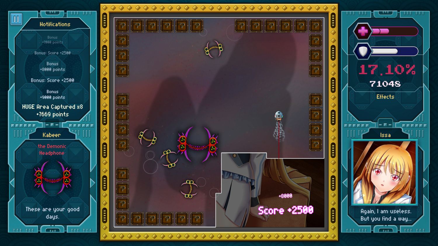 Los jugadores habitan el extraño duende flotante de un bigotudo incorpóreo. Robocop dobles en su noble búsqueda por descubrir gráficos de personajes de mujeres cada vez más desnudas, dibujadas en un estilo anime ecchi ligeramente poco refinado. Sorprendentemente, hay mucha historia en un gallo, pero estos dramas intencionalmente absurdos están innatamente oscurecidos detrás de una gruesa capa de simplicidad mecánica. Cada uno de los 24 niveles del juego presenta un jefe enemigo peligroso y varios minions menos poderosos que molestan al elenco de damiselas en apuros, y el objetivo es siempre capturar una cantidad suficiente de territorio en pantalla para enviar al enemigo jefe a empacar. Vale la pena señalar que ninguno de un galloEl inspirado resurgimiento del juego arcade se centra en el contenido gráfico, pero funciona bastante bien aquí.