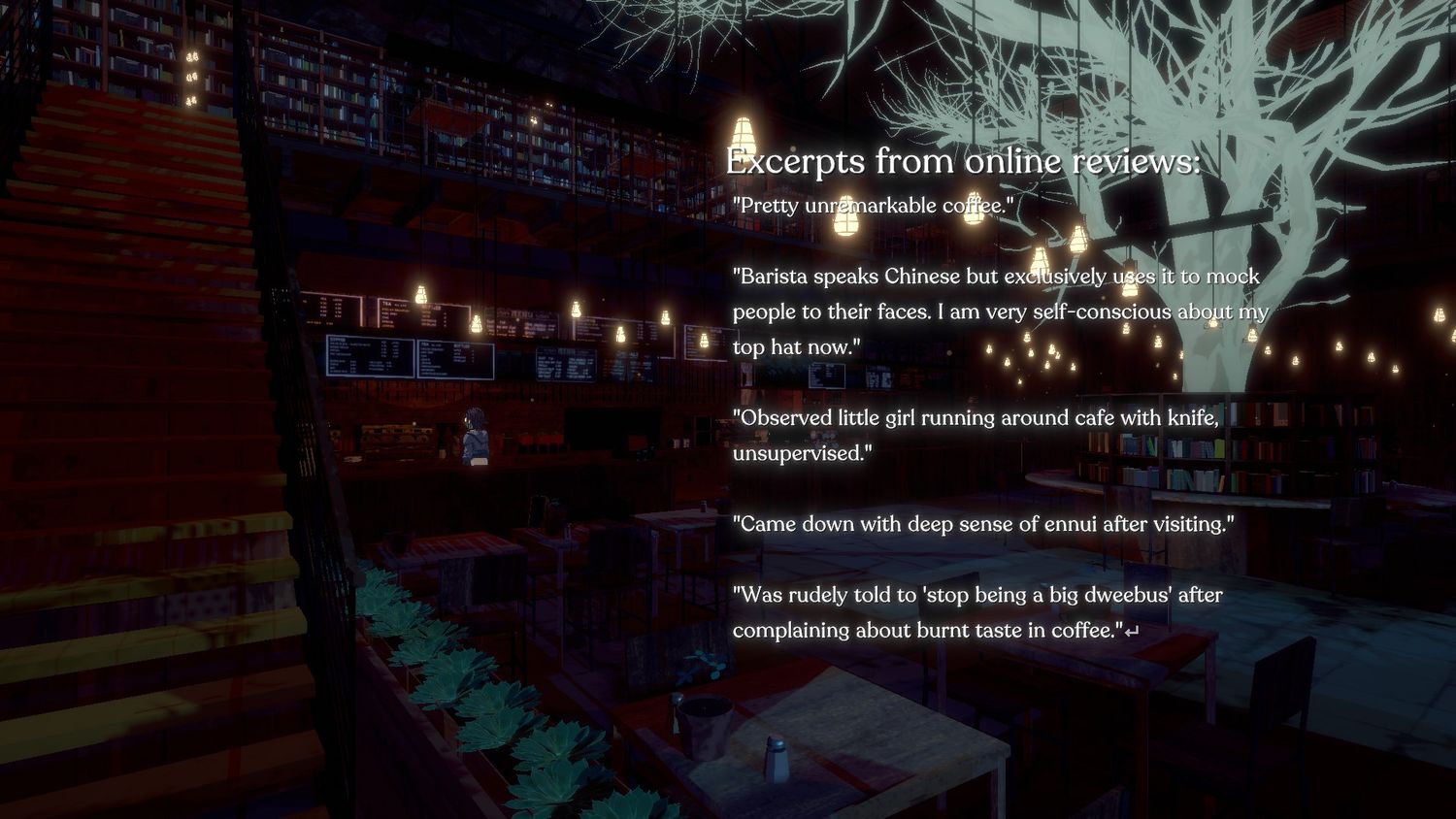 Las pocas decisiones que hay se encuentran en Memorias, historias paralelas contadas en prosa que se pueden abordar a través de secciones intersticiales de FPS entre NecrobaristaLos capítulos sencillos. Aquí los jugadores pueden pasear por la cafetería y resaltar ciertos objetos que conducen a breves interludios y efímeras ricas en historia. Estos recuerdos contienen algunas de las mejores historias del juego, incluida una colección de reseñas de productos sobre un accesorio ritual, el relato de un pescador sobre su profesión mortal y el escritor/nigromante favorito de Maddy respondiendo al correo de sus fans.
