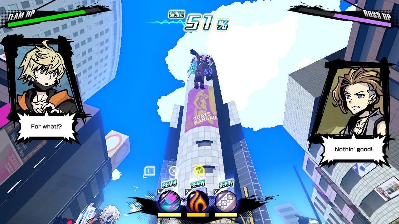 Aunque suene agitado, NEO: El mundo termina contigo El combate es notablemente fácil de entender. Pulsar un solo botón para obtener habilidades facilita el uso de múltiples ataques a la vez, y las estrategias comienzan a surgir casi inmediatamente después de descubrir cómo cronometrar los ataques para crear más oportunidades y aumentar el medidor de ritmo del grupo. Una vez que el medidor Groove está al 100%, Rindo y sus amigos pueden desatar un poderoso ataque combinado que depende de los pines usados recientemente. Todo el sistema es visual y mecánicamente satisfactorio, y NEO: El mundo termina contigo El combate es una mezcla sublime de personalización y estilo.