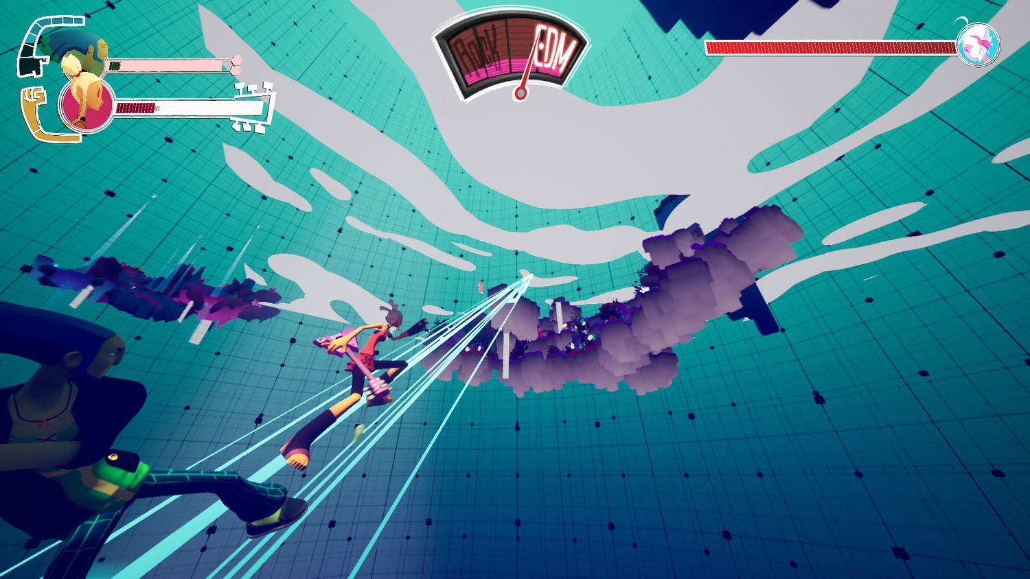 Uno de No hay caminos rectos cualidades únicas es cómo la música sigue la acción en pantalla; Los enemigos se balancean con la música de fondo, lo que a su vez les da a los jugadores una pista de cuándo están a punto de atacar. El combate hace que los jugadores salten para esquivar ataques y devuelvan los suyos durante las aperturas en el ritmo. También pueden detener ciertos ataques contra los enemigos para obtener puntos extra, aunque esto requiere una sincronización precisa para lograrlo. El juego lo pueden jugar uno o dos jugadores, y aquellos que juegan solos pueden cambiar entre Mayday y Zuke con solo presionar un botón. Ambos tienen sus propias habilidades y capacidades especiales: Mayday inflige más daño, mientras que Zuke se especializa en combos y ataques rápidos. Si uno de los héroes muere, los jugadores tienen la opción de empezar de nuevo en su punto de control actual, pero a costa de una puntuación reducida al final del nivel.
