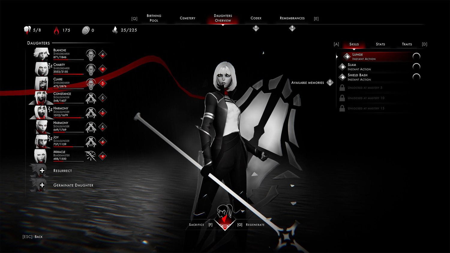 Hay 3 tipos de Hijas disponibles para los jugadores: Blademaster, de alto daño y baja defensa; el Portador del Escudo fuertemente armado; y el distribuidor de daños a distancia Soulslinger (así como una cuarta clase secreta). Cuando comienza el turno de una Hija, tiene 100 AP para gastar en movimiento y en la mayoría de acciones. Las acciones pueden ser simples ataques cuerpo a cuerpo que surten efecto inmediatamente o grandes movimientos dañinos de área de efecto que se cargan una vez finalizado tu turno. Alternativamente, los jugadores pueden sacrificar un poco del HP de una Hija para que realice acciones más poderosas basadas en reacciones hasta el comienzo de su siguiente turno, como el Soulslinger, que puede evitar que un enemigo ataque las unidades de un jugador mientras asesta un golpe significativo a la voluntad. -ser agresor. Si la Hija usa 50 AP o menos, toma su siguiente turno 50 conteos de iniciativa más tarde, pero si gasta más de 50 AP, toma su siguiente turno 100 conteos de iniciativa más tarde. Esto permite tácticas de alto riesgo y alta recompensa, e incluso se puede combinar con habilidades basadas en reacciones para que estén activas por más tiempo.