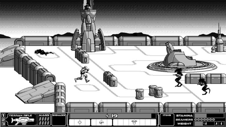 Invasor pícaro El estilo artístico es decididamente retro, con una paleta de colores en blanco y negro y modelos de personajes en 3D sombreados en celdas en un estilo cosido en cruz que recuerda a los viejos juegos de Macintosh. La historia se cuenta a través de escenas breves e irónicas, y las bromas con las que el rey Zeno ocasionalmente se burla del jugador después de perder a otro soldado son divertidas. La música consiste en una música conmovedora que recuerda las películas militares épicas de ciencia ficción.