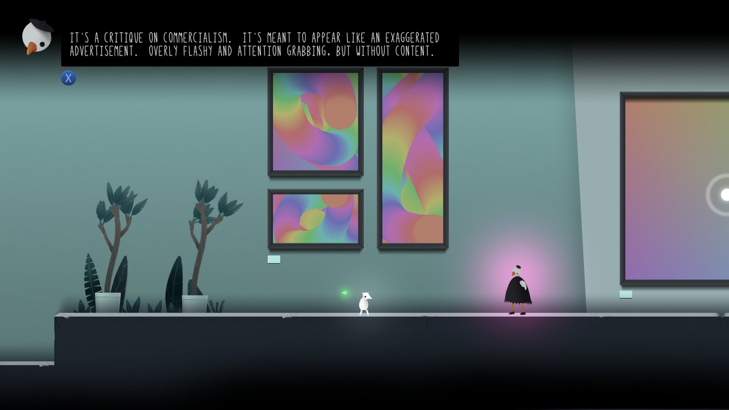 “/> Hay texto y diálogo, la mayoría deliberadamente extraños, como una criatura pájaro presentadora de un programa de juegos que se sienta sola en un escritorio al final de un pasillo esperando nuevos concursantes o el inseguro dueño de una galería de arte. Todos los personajes de oveja parecen personalidades sacadas directamente de un encantador webcomic, posicionadas para ofrecer una rápida dosis de ingenio, reflexión poética o un ataque general de rareza antes de pasar a un segundo plano.