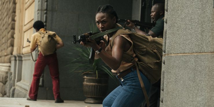 En la adaptación de Netflix de esta historia, de la directora sudafricana Mandla Dube y el guionista Sabelo Mgidi, el trío de activistas armados se ve alterado. Ahora son dos hombres y una mujer, Calvin (Thabo Rametsi), Aldo (Stefan Erasmus) y Terra (Noxolo Dlamini). Justo cuando siguen los eventos de la historia real, el trío intenta sabotear una planta de energía como una declaración contra el Apartheid. Al necesitar un nuevo plan, se apresuran a ir a un banco y comienzan a hacer demandas. Uno de los cuales es liberar a Nelson Mandela, tal como exigieron los verdaderos activistas. Sin embargo, aunque los puntos específicos son fácticos, Asedio de Silverton lleva a casa el hecho de que esto no es un recuento de hechos reales. Dube está interesado en hablar con su audiencia para enseñarles algo y celebrar el espíritu detrás de estos activistas.