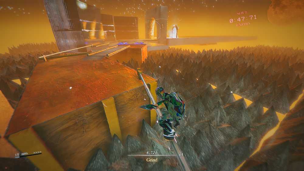 Cuando aparecen requisitos de puntuación, generalmente es en la forma de los jefes lunares del juego, que requieren que encadenes trucos y crees un combo de puntuación, luego pisoteas a un rematador en una zona objetivo. Alternativamente, las sesiones cuesta abajo de salto de portal presentan objetivos que desbloquean la salida, como recolectar símbolos o tomar aire. Algunas de estas secciones y jefes tienen tiempo limitado, lo que presenta la única fricción ocasional del juego, pero eres libre de derramar y volver a intentarlo hasta el contenido de tu corazón sin cesar..