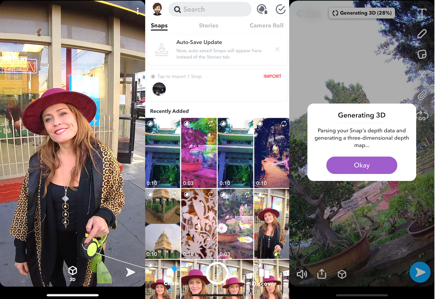 Lo nuevo son las fotos y videos en 3D. Utilizan el espacio entre las cámaras estereoscópicas en las esquinas de Spectacles y utilizan paralaje para detectar la profundidad de una escena. Después de tocar el botón 3D en una foto, puedes mover la perspectiva de la imagen para ver casi los bordes de lo que estás mirando. Las gafas se desplazarán automáticamente de un lado a otro y exportarán fotos en 3D como videos cortos de seis segundos tipo Boomerang.