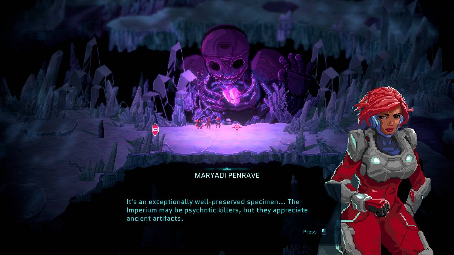 Según nuestro original Renegados estelares En la vista previa, la historia del juego es una mezcla de universos paralelos, rebeldes poderosos y una dosis dominante de bromas sarcásticas. La historia más amplia que solo se insinúa en la versión preliminar termina lamentablemente consistente con el juego completo, y es sorprendente lo poco que realmente importa. Algunas conversaciones marginadas se asignan al azar dependiendo de la selección del escuadrón, los enemigos repiten como loros las mismas bromas tontas de “MUERTE A LA HUMANIDAD CARNE” en cada partida, y la mayor parte de la narrativa solo se enfatiza realmente al principio y al final del juego. Esto no quiere decir que sea completamente malo, o incluso que un buen roguelike sobreviva gracias a su historia, pero el hermoso mundo presentado aquí recibe muy poco contexto o apoyo.