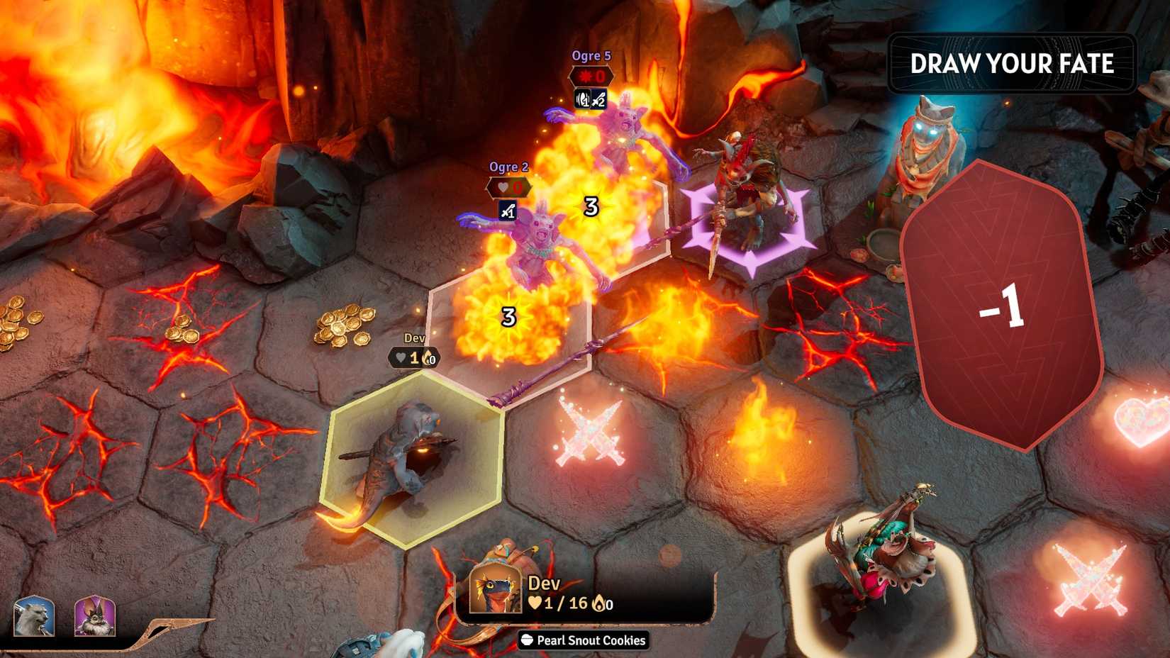 Los jugadores comienzan con tres cartas de habilidad que sirven como movimientos, ganando seis más cada vez más poderosos con el tiempo, aunque el juego limita cuántos pueden llevar a la batalla. Las baratijas, las armas y los alimentos también afectan cada pelea y se pueden alterar entre las misiones para adaptarse mejor a lo que sigue. Algunas bebidas brindan protección contra lava o fuego, por ejemplo, que pueden ser excelentes antes de ciertos entornos, y las baratijas se pueden usar una vez por batalla y hacer todo, desde debilitarse en los enemigos hasta teletransportarse a los jugadores a través del mapa. Las armas necesitan desencadenantes específicos, como los enemigos que hacen daños cero, que requieren un pensamiento aún más estratégico.