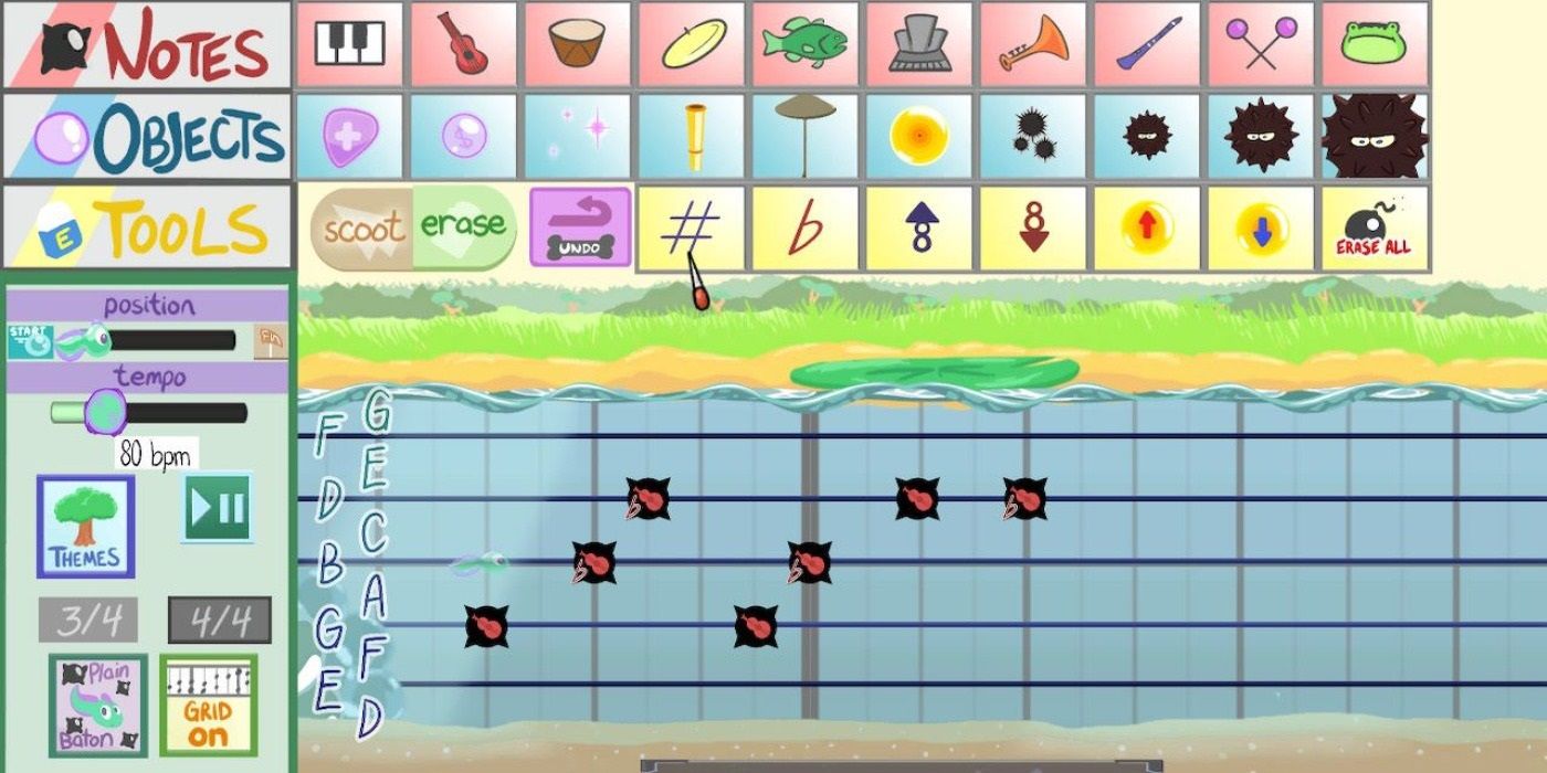 Una de las mejores partes de Bis de agudos de renacuajo es el modo Composición, que permite a los jugadores crear niveles aplicando notas musicales a un escenario en blanco. El diseño pretende emular al creador de música en pintura mario, y hay muchas opciones en cuanto a instrumentos musicales y peligros escénicos. El modo Composición puede ser lento de usar cuando se juega con un controlador, pero usar la pantalla táctil en Switch también es más rápido y fluido. El jugador necesitará algunos conocimientos sobre cómo funcionan las partituras para recrear canciones con las que está familiarizado, y fueron necesarios varios intentos para lograr el ritmo de la introducción de “The Boys Are Back in Town”.
