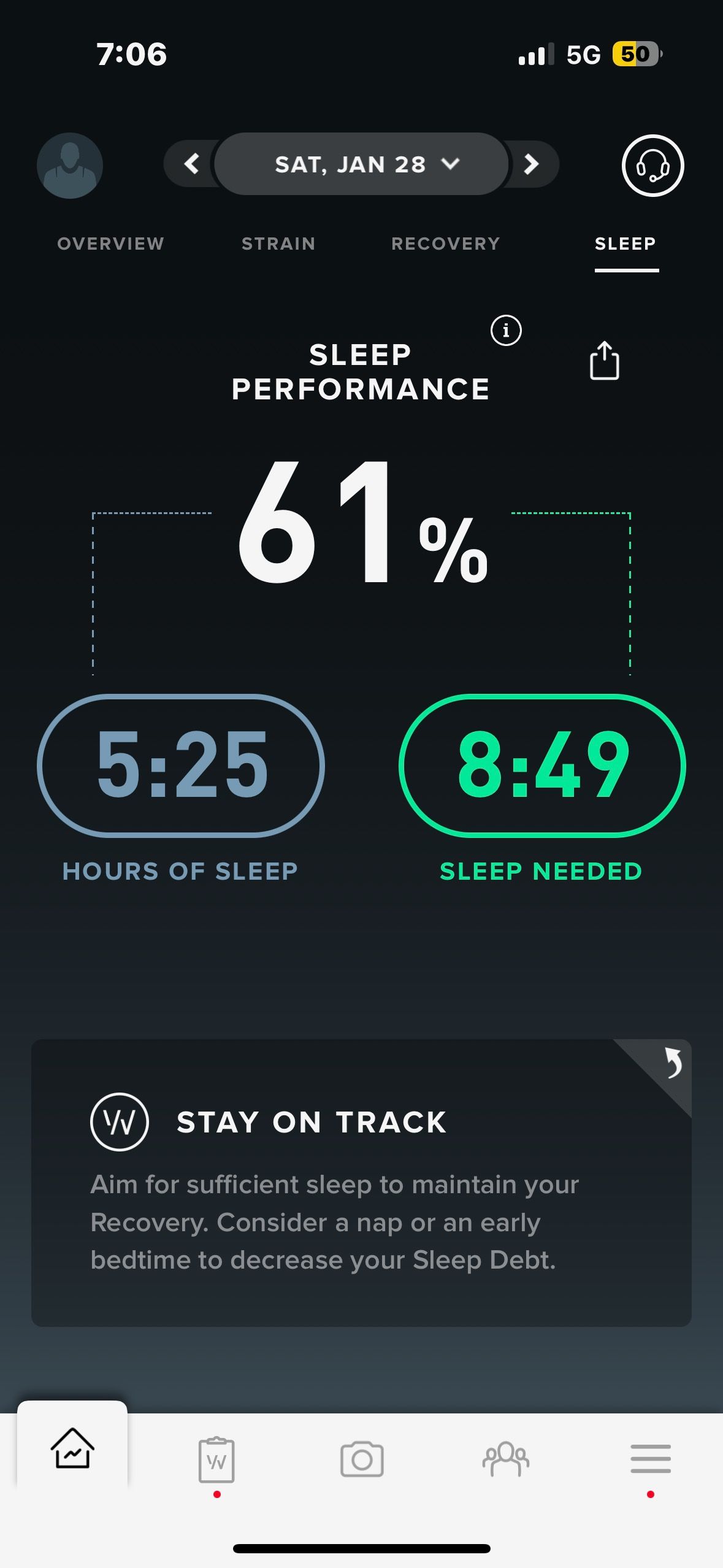 En cambio, Whoop 4.0 se centra en tres puntos de datos: sueño, recuperación y tensión. El rastreador identifica los cuatro tipos de etapas del sueño (despierto, ligero, profundo y de movimientos oculares rápidos (REM)) y los presenta como porcentaje y tiempo. Por ejemplo, en una noche, Whoop 4.0 detectó casi 6,5 horas en la cama, pero identificó el 16 por ciento de ese tiempo como despierto.