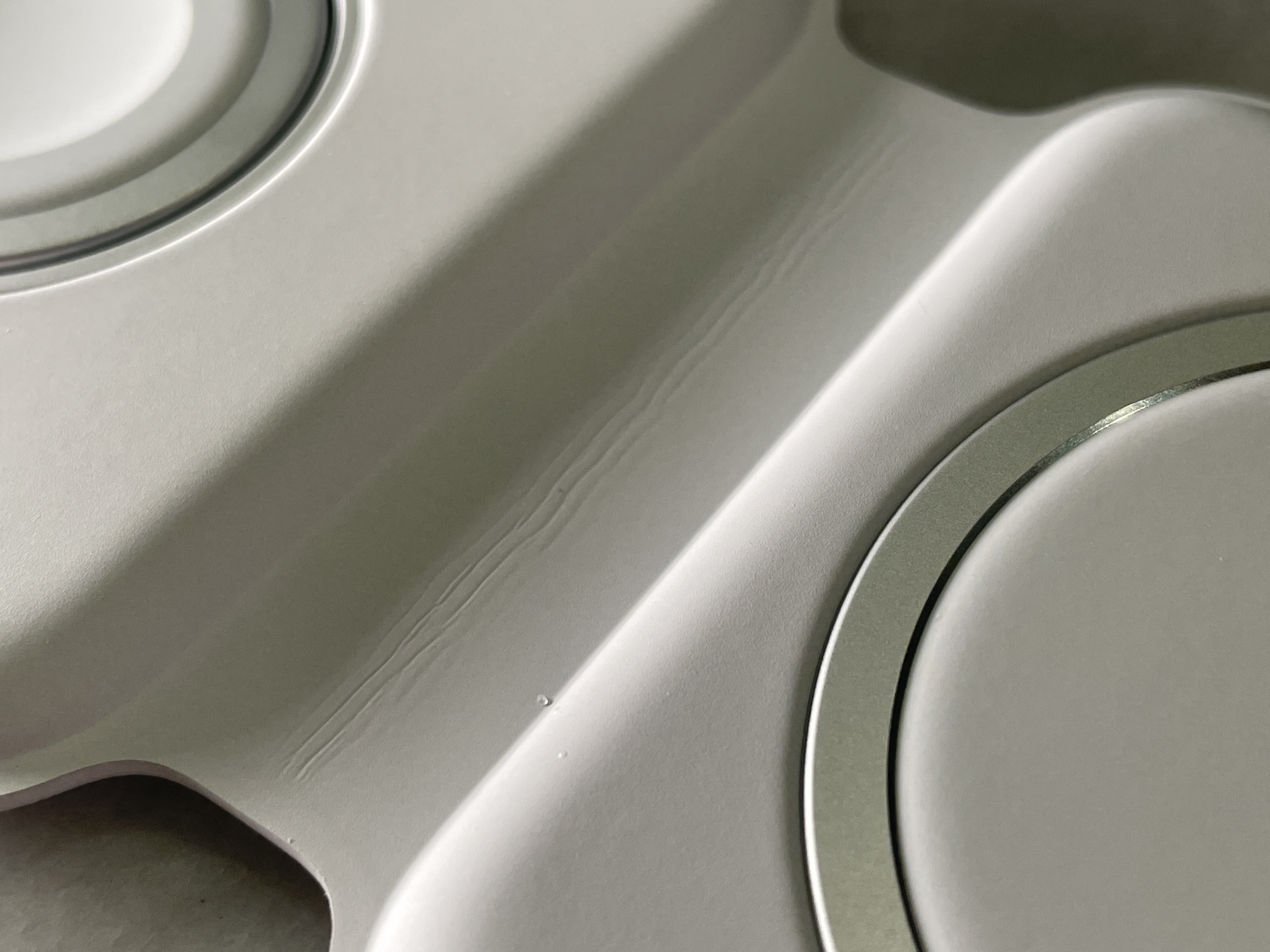 Debido a que todo está moldeado a presión, también existe este borde que se extiende alrededor del exterior de la unidad. Tiene un sello básico, pero puedes ver las capas de laminación si miras de cerca. Parece estar listo para mellar, deshilachar, doblar y ensuciar. No es genial para algo que está destinado a tirar en una bolsa.