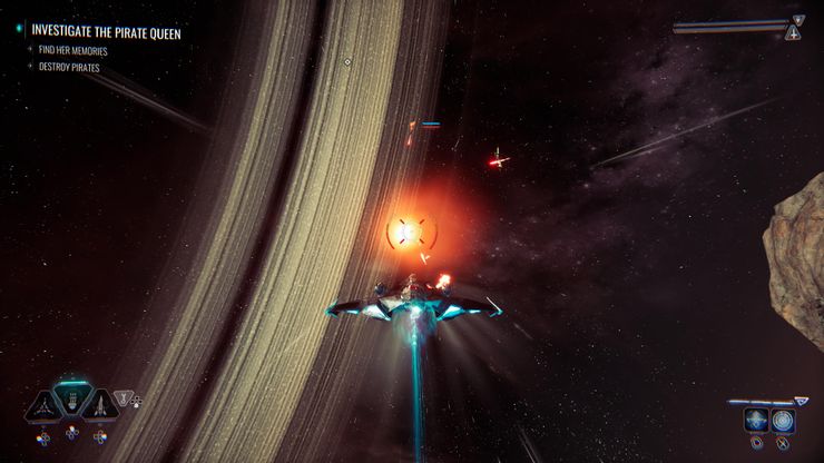 Un simulador de combate espacial vive o muere de sus peleas de perros, y Coro es excepcional en este sentido. Combate en Coro es una auténtica maravilla, ya que el jugador tiene un excelente nivel de control sobre los Renegados mientras giran y cambian para obtener la ventaja sobre El Círculo u otros enemigos como los piratas espaciales. También hay naves más grandes para derrotar que requieren un enfoque más táctico de cerrar los escudos para alcanzar los núcleos de los reactores, y también batallas de jefes contra enormes enemigos que deben ser desarmados poco a poco.