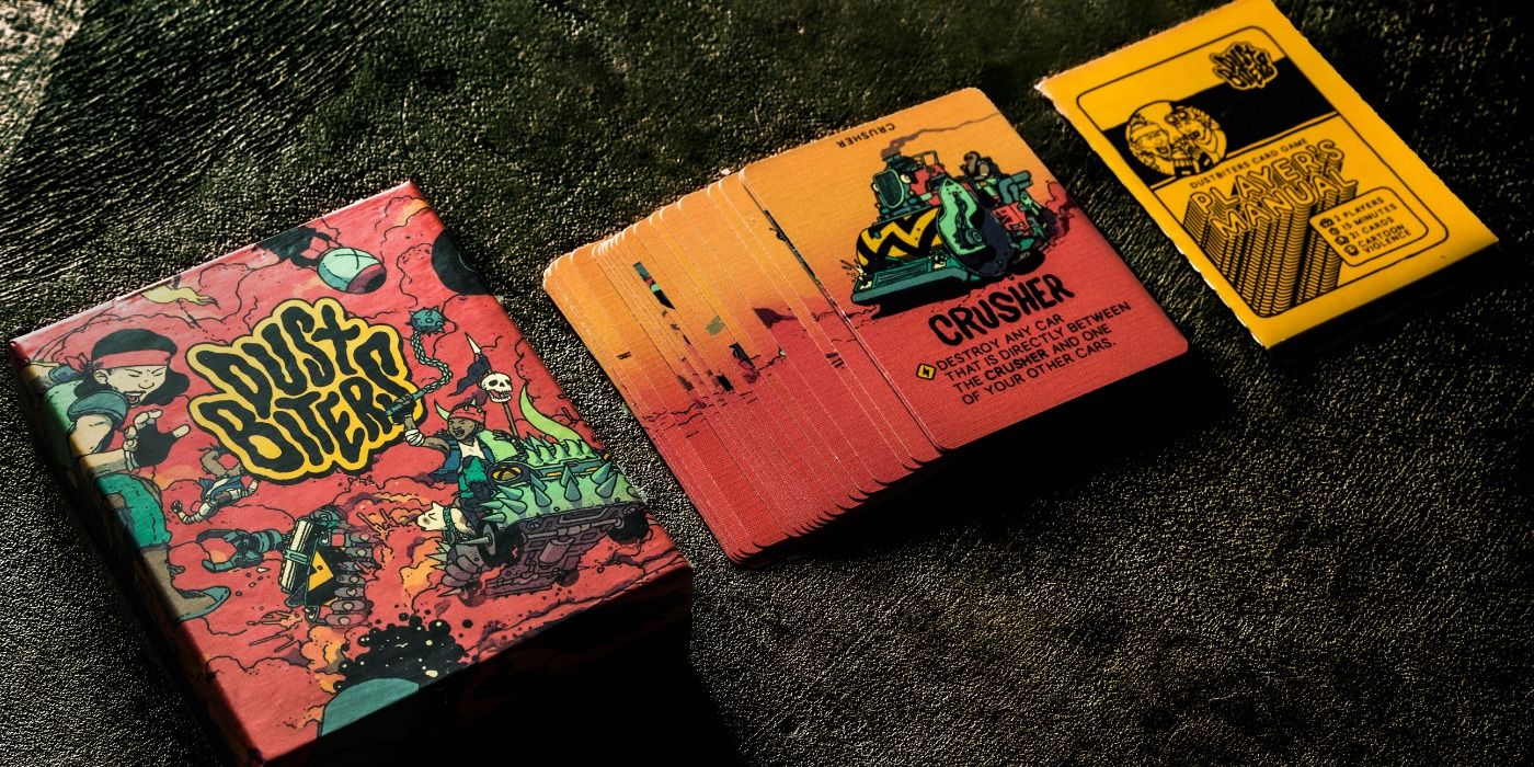 El Mordedores de polvo El tema recuerda a la película del Apocalipsis. Mad Max. Cada jugador controla un convoy de vehículos que se alejan de una tormenta de polvo gigante y, al final de cada ronda, el coche que esté detrás será destruido. El objetivo de Mordedores de polvo es tener el control de todos los vehículos en el tablero o simplemente ser el último automóvil en pie. El juego comienza con ocho autos alineados, cuatro a cada lado, y cada turno otorga al jugador tres puntos de acción que pueden usarse para moverse, robar nuevas cartas, colocar una carta en la línea o activar el poder especial de un auto. A lo largo del juego, los jugadores competirán por una posición mientras intentan robar o destruir las cartas del otro jugador.