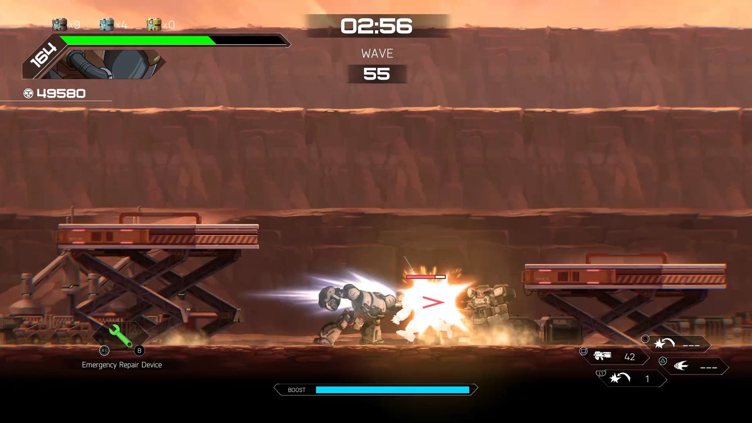 Aparte de las dificultades para acceder a un juego en línea, el mayor problema con Mecha duro en Switch la velocidad de cuadros cae. Estos ocurren muy raramente, pero cuando suceden pueden ser bastante debilitantes. Parece que cuando hay demasiados enemigos o proyectiles en la pantalla a la vez, el juego no es capaz de procesarlos. Esto provoca algunos tartamudeos bastante masivos a medida que la velocidad de cuadros desciende a un solo dígito. Normalmente sólo dura un par de segundos, pero en un juego como Mecha duro eso puede significar vida o muerte.