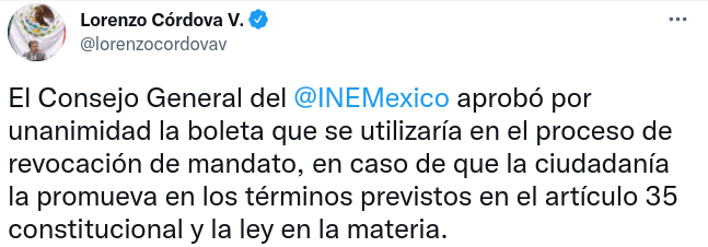 Así lo dio a conocer el consejero presidente del INE, Lorenzo Córdova, a través de redes sociales, y compartió junto al mensaje una ilustración de la papeleta que se utilizaría en el proceso que se celebrará el 27 de marzo de 2022, en caso de que la ciudadanía la promueva en los términos previstos en el artículo 35 constitucional y la ley en la materia.