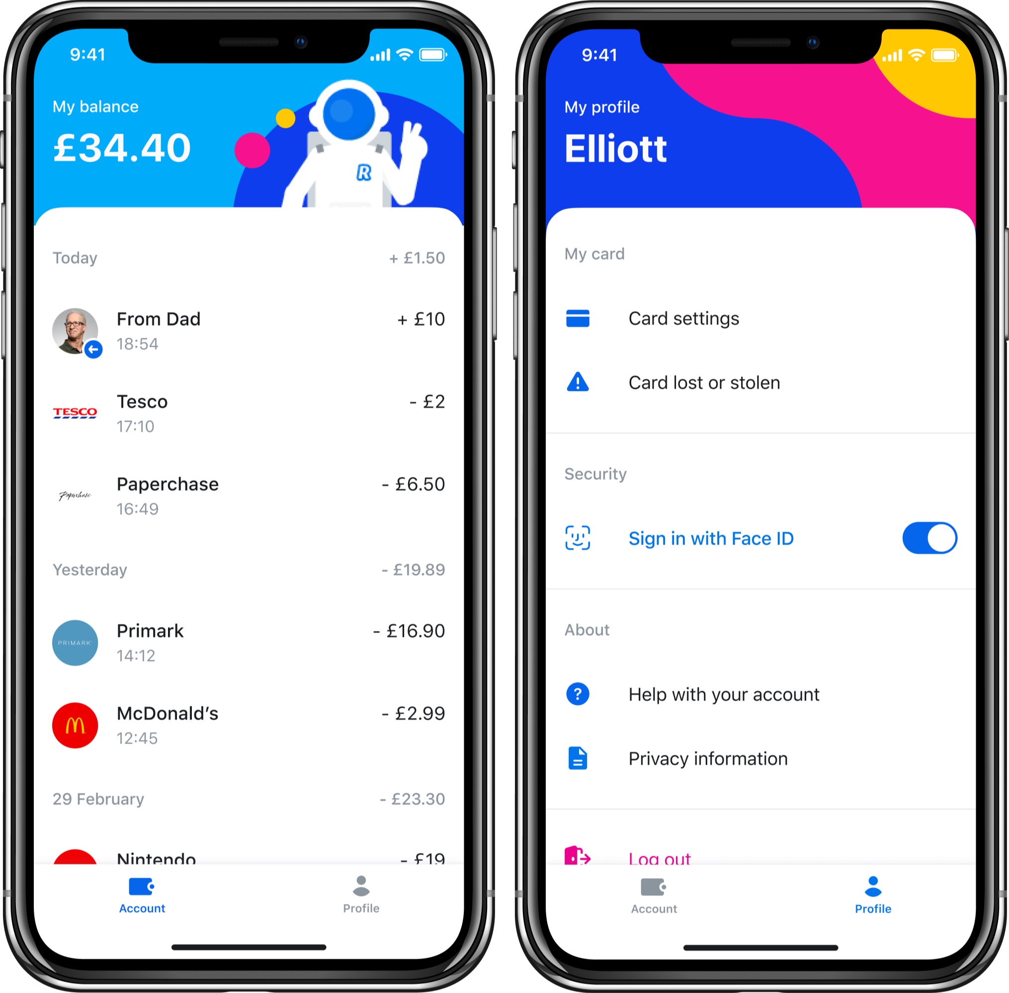 La nueva aplicación ofrece un conjunto limitado de funciones con una interfaz dividida en dos pestañas: Cuenta y Perfil. Los niños pueden ver una lista de transacciones en tiempo real en la pestaña Cuenta. Pueden configurar los ajustes de la tarjeta en la pestaña Perfil. Y eso es todo.