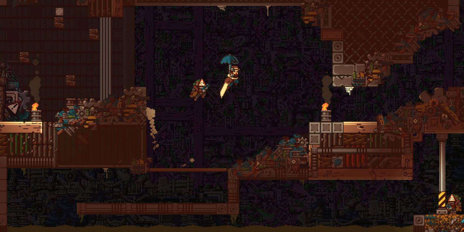 A diferencia de muchos juegos de plataformas de acción 2D modernos, que tienden a ser Metroidvanias, Gunbrella es completamente lineal. En realidad, se siente refrescante tener una experiencia sencilla de correr y disparar con algún rompecabezas ocasional mezclado, pero esa brevedad también significa que no hay barreras que requieran habilidades o mejoras específicas para superar. Si bien esa linealidad es una parte positiva de la experiencia, también hace que los elementos de los juegos de rol, como actualizar el arma, sean una mecánica menor, si no completamente olvidada.