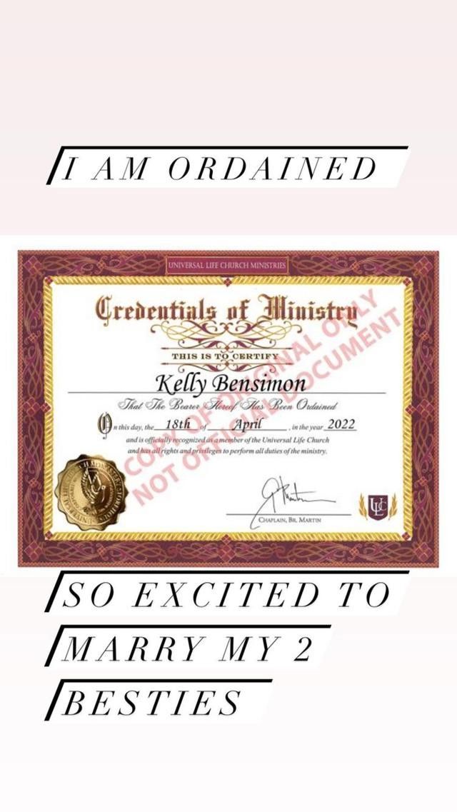 El 18 de abril, Kelly anunció que ahora es ministra ordenada y que se casará con sus dos mejores amigas en sus próximas nupcias. Publicó una foto de su certificado de ordenación, que recibió de Universal Life Church (ULC). El certificado establece que Kelly tiene todos los derechos y privilegios para realizar todos los deberes del ministerio. Kelly se entusiasmó con su nueva posición en sus historias de Instagram, escribiendo, “Soy ordenado”, antes de expresar su entusiasmo por casarse con sus dos mejores amigas. Sin embargo, no está claro quiénes son los mejores amigos de Kelly, ya que no reveló sus identidades.