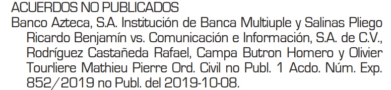 Sin embargo, el mismo Poder Judicial violó la medida de censura: en el Boletín Judicial del pasado viernes 11 publicó los nombres de los demandantes –Salinas Pliego y Banco Azteca– así como de los demandados –Comunicación e Información, S.A. de C.V., Rafael Rodríguez Castañeda, Homero Campa Butrón y Mathieu Pierre Olivier Tourliere–.