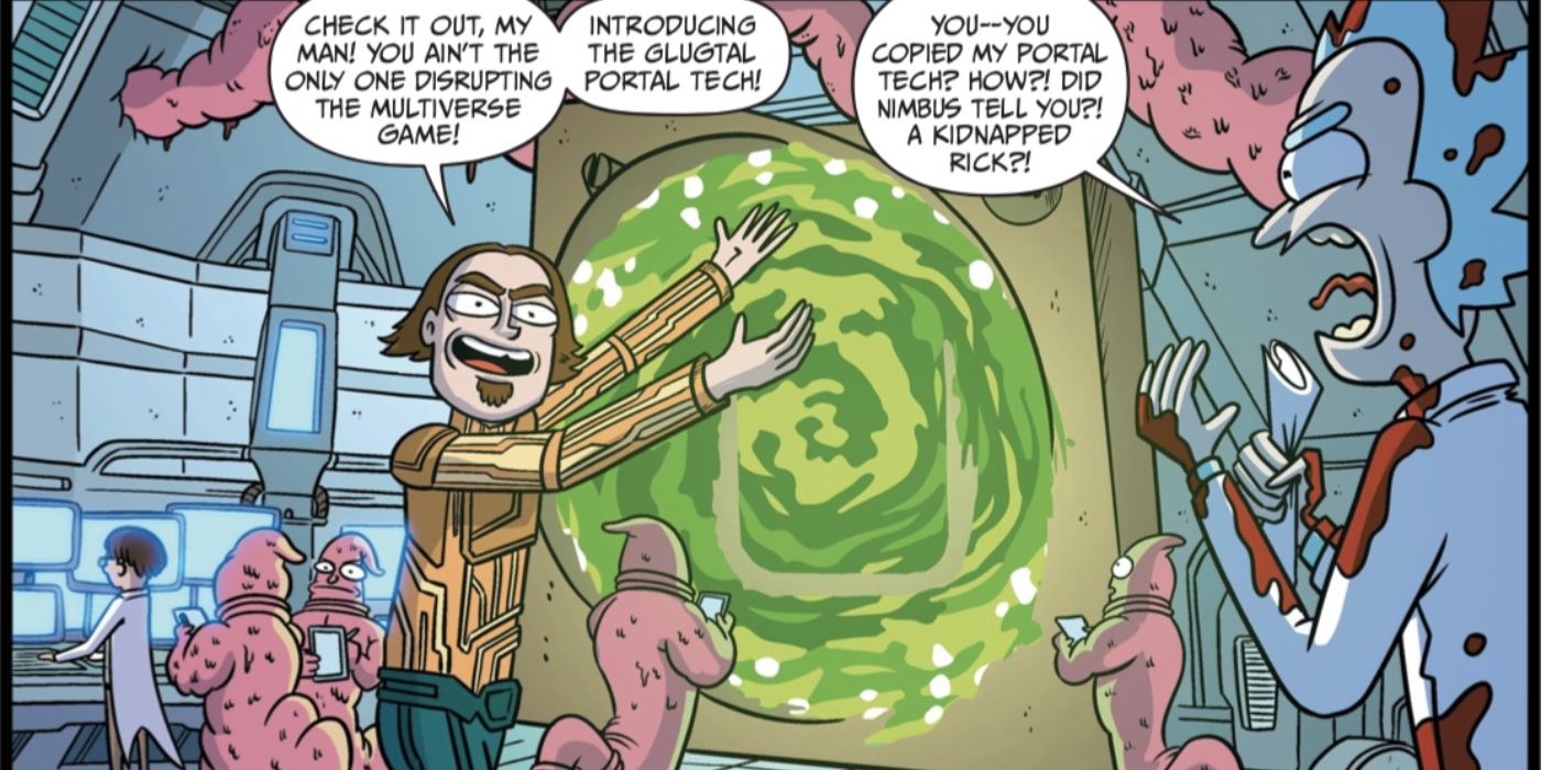 En rick y morty # 4 de Alex Firer y Marc Ellerby, un multimillonario tecnológico llamado Vronsky aparentemente descubrió cómo lograr un método similar de viaje interdimensional como Rick, y secuestra a Rick para mostrárselo en un esfuerzo por demostrar su valía y convertirse en el nuevo universo aventurero de Rick. socio en lugar de Morty. Cuando Rick ve esto, reacciona visceralmente gritando: “¿Copiaste la tecnología de mi portal? ¡¿Cómo?! Nimbus te lo dijo?!”.