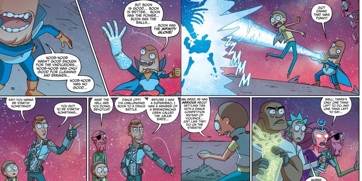 Cuando el método MCU no funciona para derrotar a este Thanos rick y morty villano, Rick inicia una táctica de batalla que es mucho más brutal y mucho más acorde con el tono de esta serie. Para derrotar a Boon, Rick usa una caja de Meeseeks y produce cientos de ellos, dándoles la tarea de destruir a Boon. Las formas de vida temporales de piel azul pululan sobre Boon como una horda de hormigas de fuego y lo destrozan brutalmente, un método que es mucho menos colorido que un enfrentamiento final de baile pero que demostró ser muy efectivo. A lo largo de este número, Rick y Morty se burlan de varias propiedades de los superhéroes a través de parodias ridículas y llamadas en la nariz. Si bien algunos son absolutamente ridículos, este que desafía el final de Guardianes de la Galaxia es bastante preciso y deja en claro que Star-Lord realmente no debería haber superado su primera película.