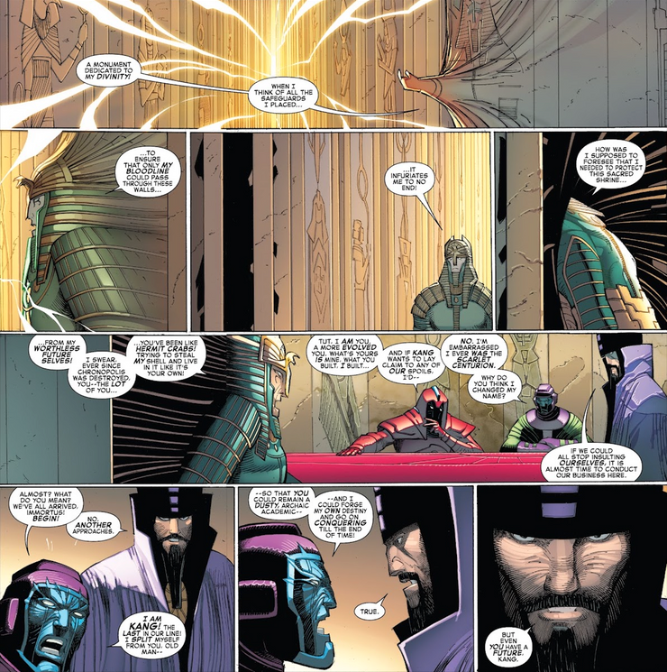 En Los Cuatro Fantásticos # 35 (en celebración del 60 aniversario del equipo), se cuenta una historia épica en la que Kang el Conquistador se une a sus otras variantes a lo largo del tiempo para derrotar a los Cuatro Fantásticos en múltiples épocas a la vez. Rama-Tut, el primero de los Kangs, se burla de sus otros “hermanos” por su inferioridad (está en la naturaleza de Kang creerse a sí mismo por encima de todos los demás, incluso entre sus otros yo). Dice que desde que cayó Chronopolis, han “… ¡sido como cangrejos ermitaños! ¡Intentando robar mi caparazón y vivir en él como si fuera tuyo!” Esta es una declaración bastante irónica, considerando que se mencionó una línea similar en la temporada 3 de Rick y Morty en 2017.