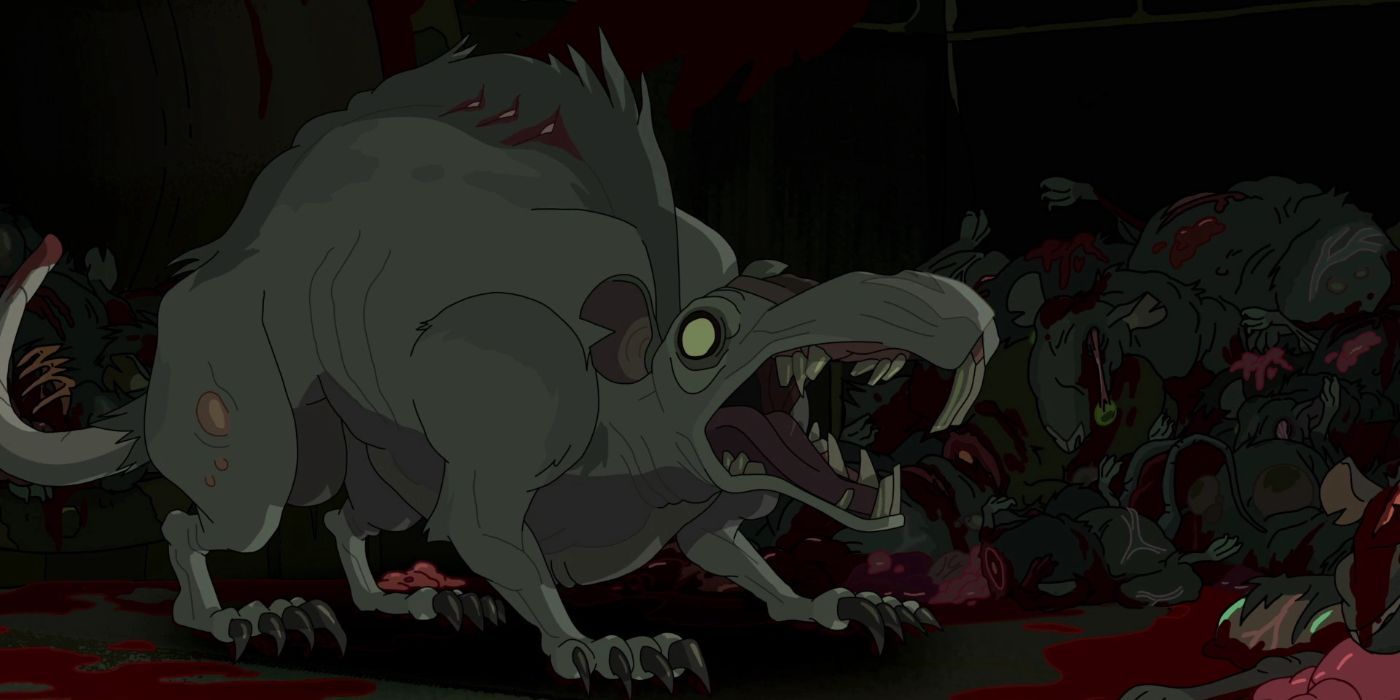 En cambio, los artistas resaltaron los aspectos horripilantes de las ratas. Extendieron sus espinas, agregaron protuberancias y forúnculos para que parecieran enfermizos, agregaron dientes más afilados y más grandes para hacerlos parecer más temibles, quitaron pelo de algunas manchas de su piel y les dirigieron una mirada vacía y sin pupilas. Fue una buena elección y el resultado es que Las ratas que Pickle Rick convierte en carne picada son todas de aspecto malvado.. Hace que su masacre en las alcantarillas sea mucho más aceptable.