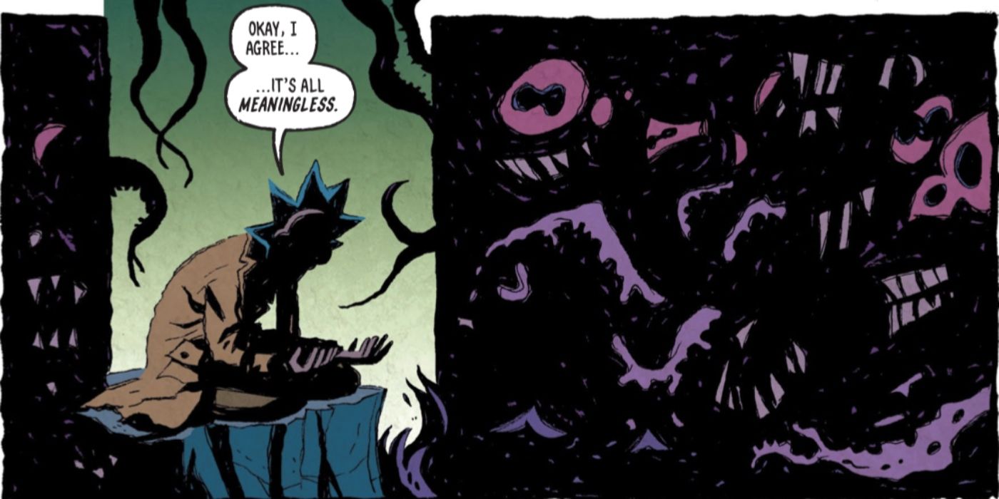 Cuando Rick se enfrenta a Azathoth, básicamente se rinde de inmediato y admite la derrota. Claro, lanza algunos insultos a este agujero negro viviente del caos, pero ni siquiera intenta combatir. Este es un momento aleccionador para Rick como personaje, y uno impactante para rick y morty aficionados. Rick literalmente fabricó su propio multiverso a través de la curva finita central, burló a los demonios ‘Hellraiser’ del infierno y luchó contra Zeus en el espacio exterior, lo que resultó en la muerte de Zeus. Pero aquí, Rick sabe que no puede hacer nada contra Azathoth, ya que una vez que este ser tiene control sobre alguien, no hay ningún lugar al que puedan ir para escapar.