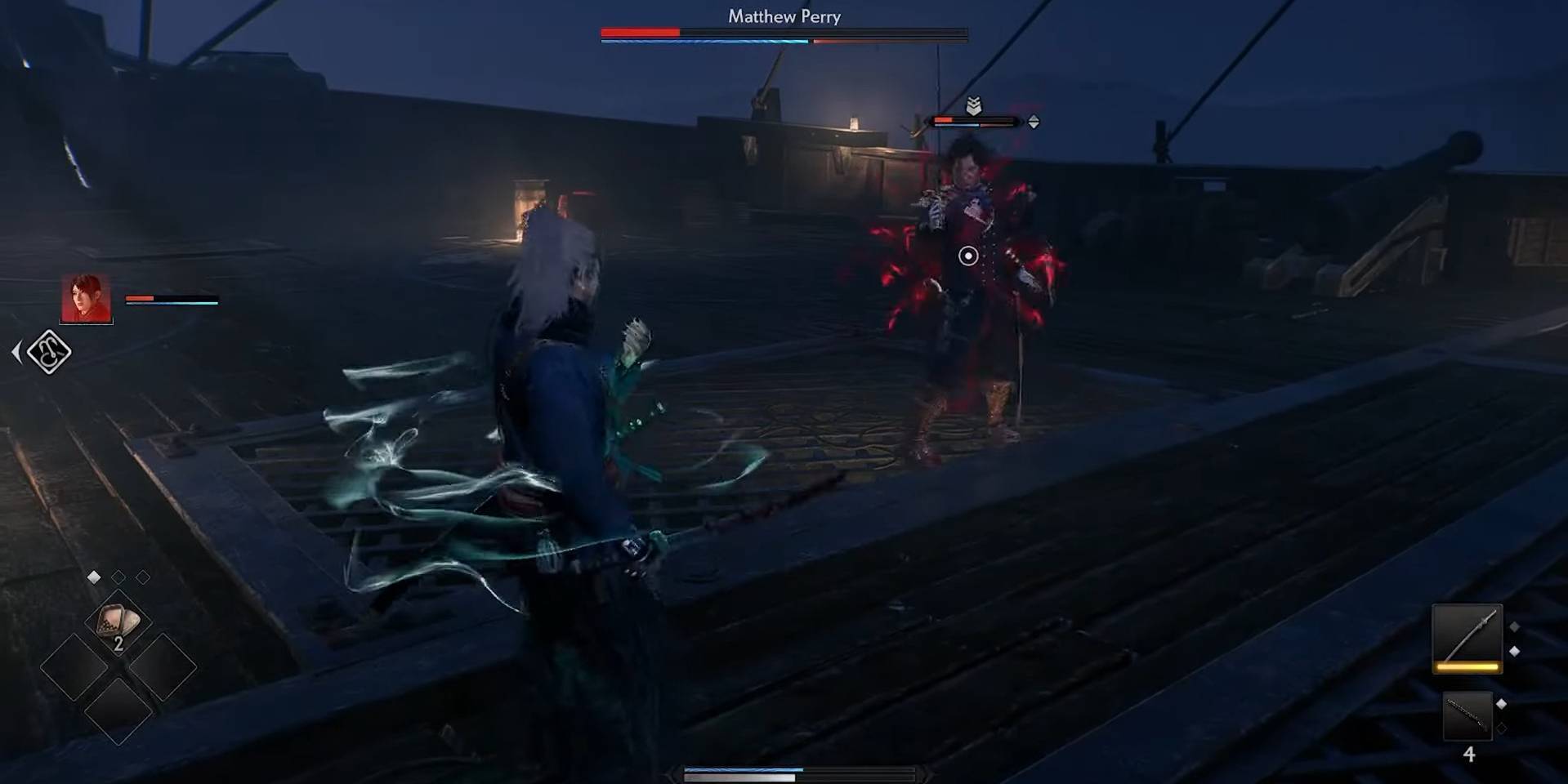 A pesar de ser el primer jefe de El ascenso de los RoninMatthew Perry no es fácil de vencer. Ataca en combos rápidos, esquiva con frecuencia y dispara a los Mellizos si se desvían demasiado. El Comodoro también es el primer jefe con Arte Marcial y Ataque Pesado.lo que puede agotar significativamente tus barras de salud si no se esquiva o se contraataca correctamente.