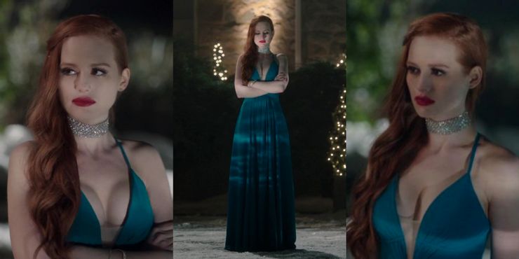La única vez que Cheryl lució un hermoso color turquesa fue cuando usó este hermoso vestido para una Riverdale fiesta. Con un escote pronunciado, el vestido largo hasta el suelo también presentaba hermosos tirantes cruzados en la parte posterior que lo hacían aún más bonito.