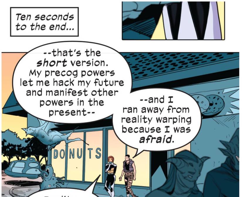 Esta evolución de los poderes de Negasonic está relacionada con su principal don de precognición. En este arco, su precognición le permite “robar” accidentalmente poderes de su futuro potencial. En una línea de tiempo, ella roba el poder de Galactus después de que previó el fin del universoreemplazando al Devorador como su sucesor. La TVA está específicamente detrás de Ellie porque accidentalmente tomó poderes de deformación de la realidad del futuro, pero al final de la serie, Ellie envía sus poderes prestados de regreso al futuro, con la promesa de estar lista para ellos si algún día se manifiestan de verdad. .