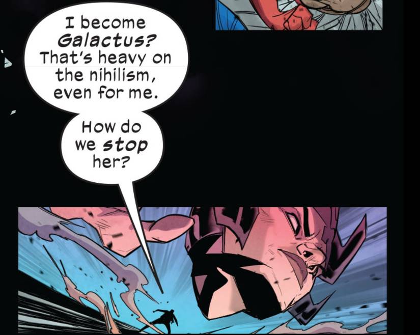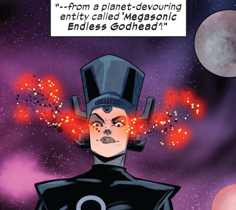 Lo mejor de la forma Galactus de Negasonic es cómo literaliza su conflicto interno.. La racha nihilista de Ellie ha sido una constante desde su primera aparición, y las declaraciones de TVA de que destruirá el universo sólo parecen demostrar que nada vale la pena. The Megasonic Endless Godhead es la literalización de este miedo: una versión de Ellie que ha destruido todo y existe solo para arruinar lo que queda. Ellie es lo suficientemente inteligente como para denunciar este nihilismo en la página. Quizás haya pasado demasiado tiempo con Deadpool.