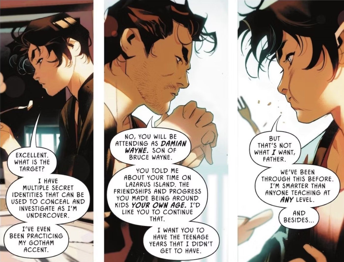 El primer indicio de esta nueva identidad aparece en batman y robin #1 de Joshua Williamson, Simone Di Meo y Steve Wands. Este libro muestra la nueva relación entre Bruce Wayne y su hijo Damian cuando comienzan a vivir juntos, lejos del resto de la Bat-Familia y lejos de Wayne Manor. Esto les da a los lectores una idea de la vida promedio de la pareja, como cuando Damian prepara el desayuno ya que Batman aparentemente duerme hasta tarde. Otra cosa que Damian hace para pasar el tiempo es dibujar manga y sus propias pequeñas historias cortas. Uno de estos sigue “Damián Vane“como el”Príncipe de Krows“, un joven destinado a tomar un manto que anhela algo más.