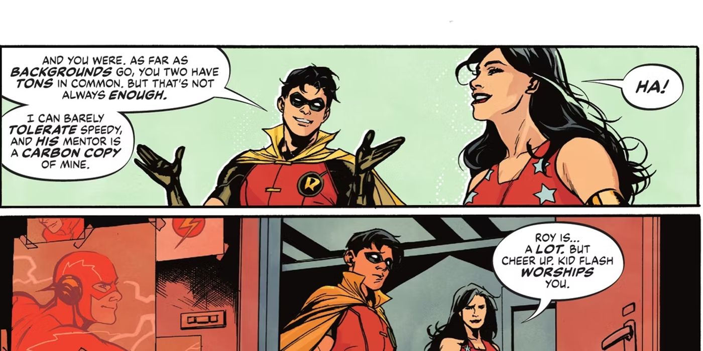 Los mejores del mundo: Jóvenes Titanes #5, escrito por Mark Waid, con arte de Emanuela Luppachino y Steve Wands, encuentra al equipo intentando ayudar a Wonder Girl y Aqualad a navegar su floreciente relación. Durante una conversación con Wonder Girl, Dick Grayson señala que él y Speedy, el protegido de Green Arrow, no se llevan nada bien, llegando incluso a reprocharle a su joven héroe que: “su mentor es una copia al carbón del mío“.