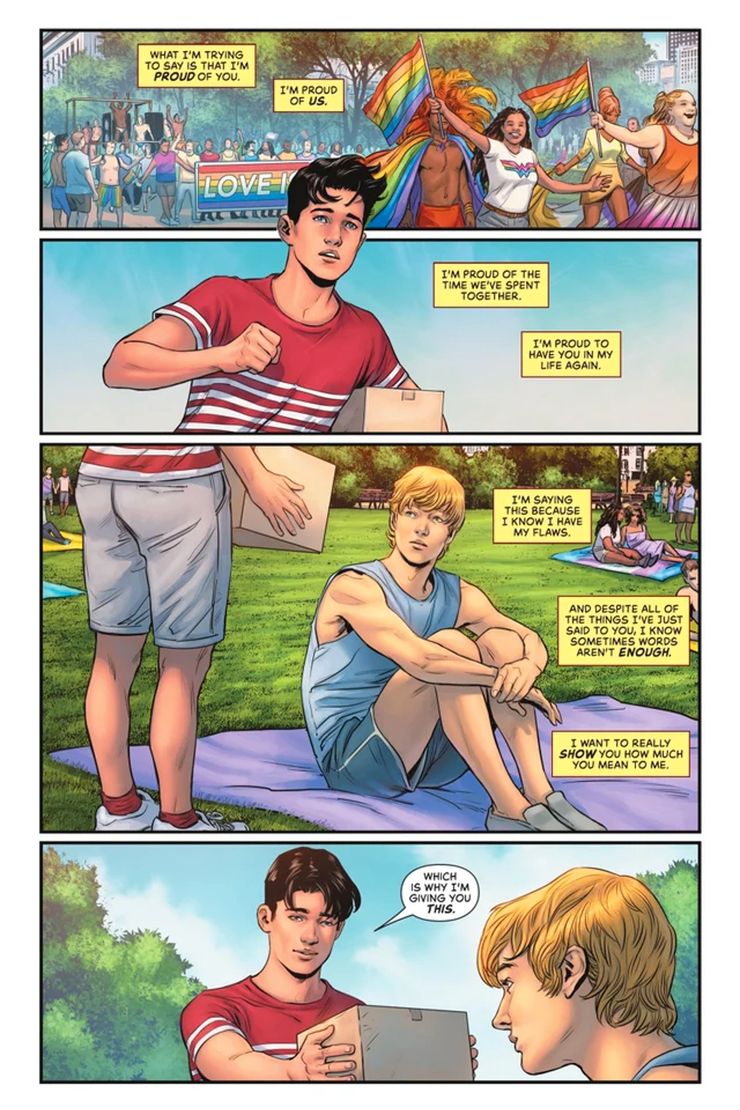 El 2022 Orgullo DC presenta una historia corta de Travis Moore, Enrica Angiolini, Ariana Maher y Michael McCalister llamada “Entrega especial”. En él, Tim llega justo a tiempo para reunirse con Bernard para una cita en el primer evento del Orgullo de este último. Llega un poco tarde después de defenderse de Micro y Macro, pero llega de todos modos con un pastel como regalo, incluso si está hecho pedazos. Esta pequeña instantánea de Tim Drake equilibrando su vida amorosa como Robin lo muestra haciéndolo mejor que Bruce Wayne como Batman.