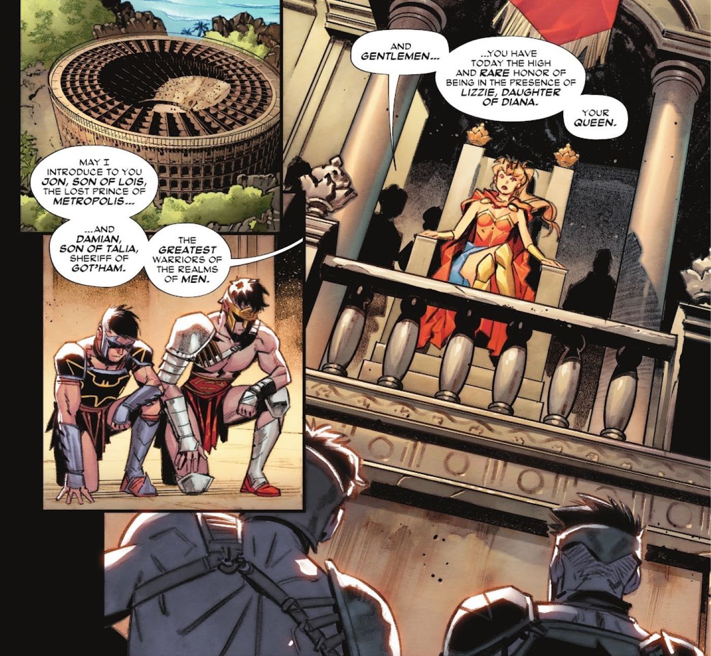 “/> Dentro de la ilusión creada por Black Mercy, se desarrolla un escenario cautivador en la fantasía de Lizzie, donde Jon, Damian y ella participan en una intensa batalla en la arena adornados con armaduras inspiradas en gladiadores. En particular, la falda de gladiador de Superboy muestra un cinturón grueso que muestra con orgullo el emblema de Superman. Robin, asumiendo el papel de Gladiador Batman, se pone una armadura en el pecho adornada con la icónica insignia del murciélago. La máscara para ojos y los guanteletes de Damian también sufren una mejora notable, cambiando Kevlar por hierro. Esta transformación culmina con el surgimiento del “Sheriff de Got’Ham” y “El príncipe perdido de Metrópolis,” creando un cuadro visualmente impresionante dentro del ámbito imaginativo del sueño.