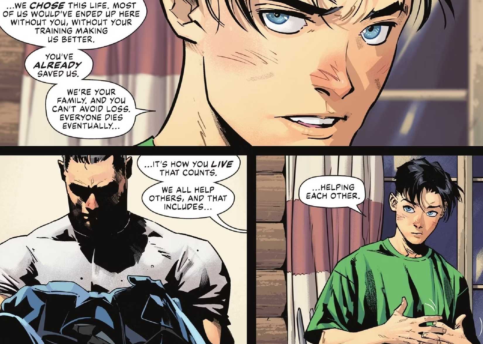 Los dos trabajan en la cabaña y hablan sinceramente sobre el caos por el que ha estado pasando Batman. Mientras Batman habla sobre el miedo que tiene de poner a su familia en peligro, Robin le dice a Bruce que sus compañeros habrían terminado luchando contra el crimen de todos modos y que el entrenamiento de Batman los salvó a todos..