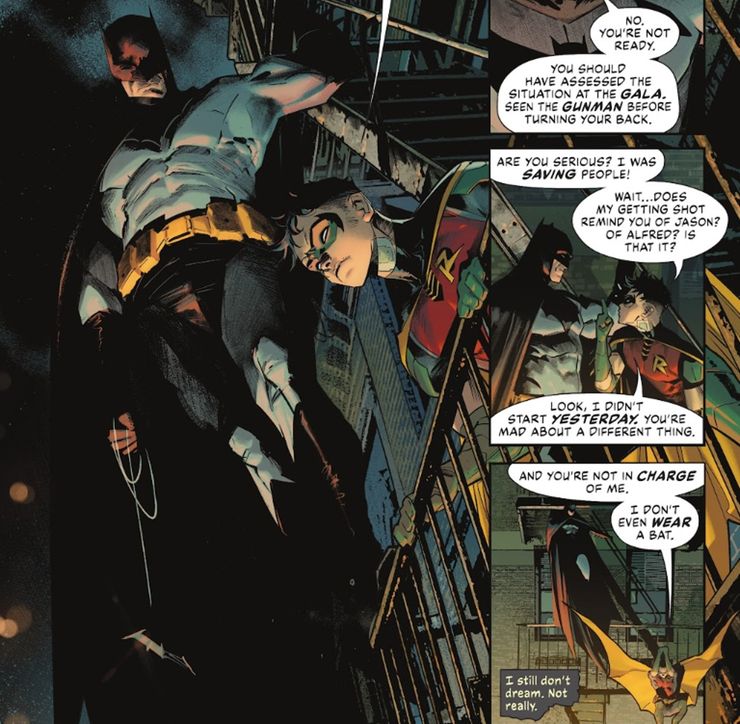 En hombre murciélago # 126 por Chip Zdarsky, Jorge Jiménez, Tomeu Morey y Clayton Cowles, Batman quiere dejar a Robin en la banca después de que le dispararon en el número anterior, a pesar de que Robin había sido autorizado para el servicio activo. Tim, como Robin, se enfrenta a Batman, alegando que está siendo demasiado sobreprotector y que solo está tratando de hacer el trabajo para el que Bruce lo entrenó: salvar a la gente. Tim cree que Bruce está molesto porque su disparo le recuerda a otros aliados que ha perdido, como el ex Robin, Jason Todd, quien una vez murió en el campo. Pero Tim tiene una respuesta para la ansiedad de Bruce: “Mira, yo no empecé ayer,” él dice. “Y no estás a cargo de mí. Ni siquiera uso un bate.“