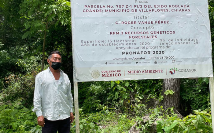 Para llegar a su parcela, debe tomar un transporte que atraviesa un largo camino de terracería. En donde termina el camino, se encuentra su campo de cultivo de árboles. “Parcela 707 Z-1 P1/2 del ejido Roblada Grande municipio Villaflores. Titular: C. Roger Vanué Pérez. Concepto: Recursos Genéticos Forestales. Número de individuos seleccionados: 29. Apoyado con el programa de Programa Apoyos para el Desarrollo Forestal Sustentable 2020 PRONAFOR RFM.3”, señala el letrero que está a la entrada.