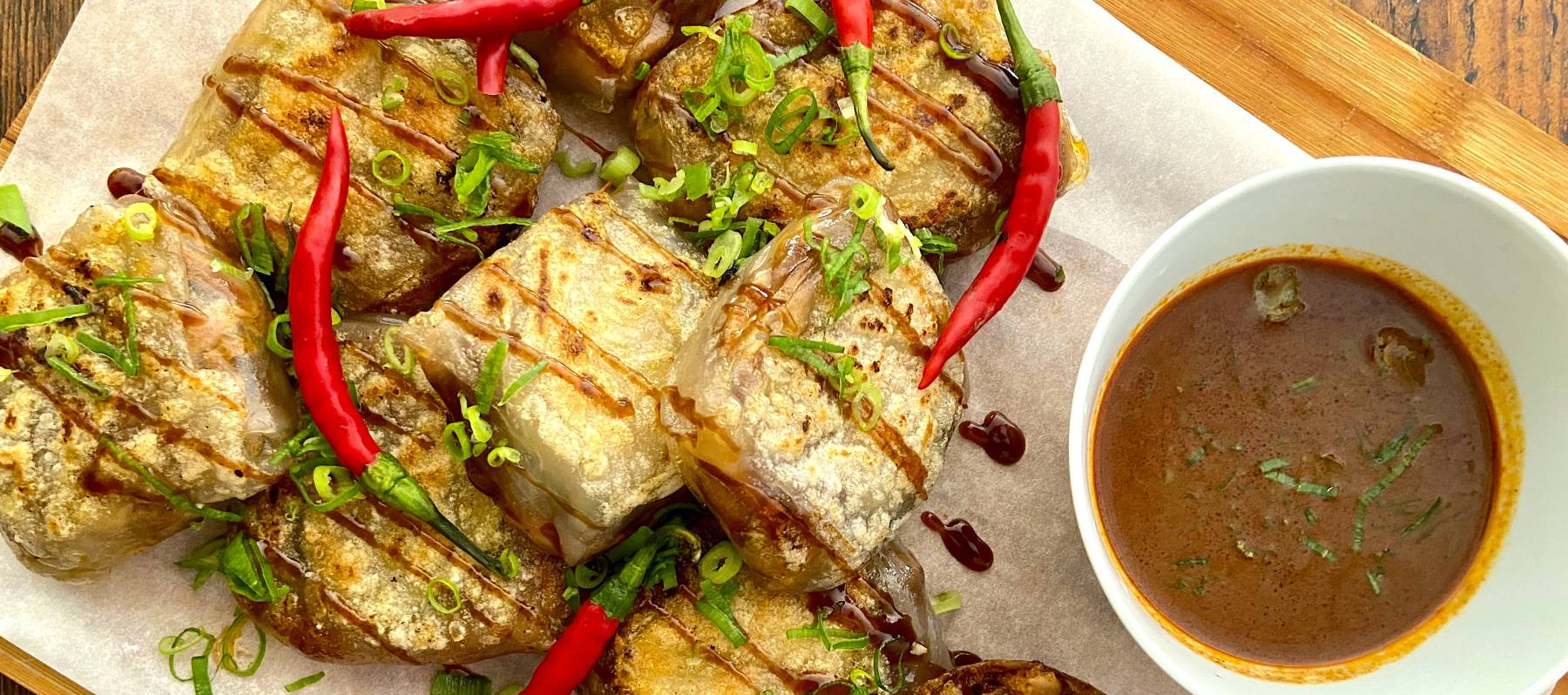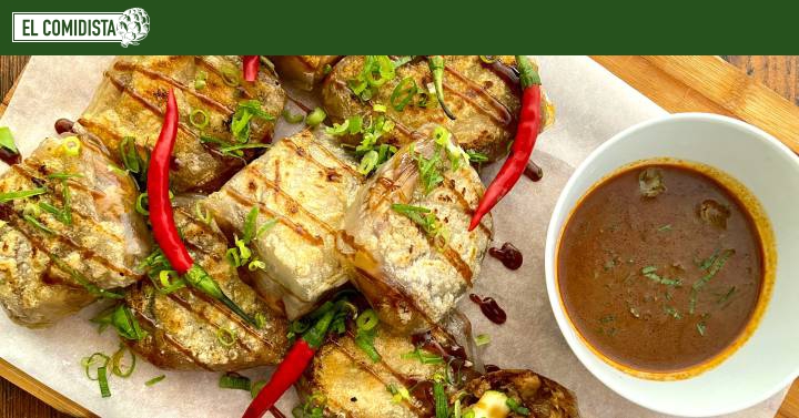 Respecto a la salsa, dependiendo del relleno podemos usar una más ligera, una más potente o directamente, ninguna. Desde una muy ligera como la de pescado thai o la china para guo tie, a base de salsa de soja, vinagre negro, ajo, jengibre y aúcar, otras más potentorras y cremosas gracias al cacahuete o incluso salsas de bote como la de tonkatsu o la de chile dulce. Si hay algo estofado y jugoso dentro, como pollo, carne o soja texturizada guisada, seguramente no le haga falta nada más, aunque unas gotas de zumo de lima o vinagre negro siempre pueden darle una chispa de alegría. Lo mismo con las aromáticas: puedes ponerle menta, cilantro, perejil y albahaca normal o tailandesa, solo una de ellas o el combo que más te guste.