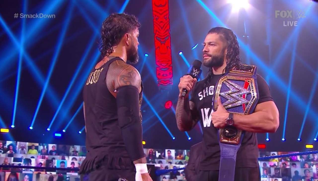 Jey Uso luego salió de la parte de atrás para ir cara a cara con su primo. Habló sobre cómo habría ganado el partido si su hermano no hubiera tirado la toalla. Roman le preguntó si pensaba que era divertido para él tener una pelea así. Dijo que no lo era. Roman le dijo que lo ama y que le dio el partido para ponerlo en el centro de atención del evento principal y darle un gran premio. Dijo que Jey avergonzaba a toda la familia y que lo estaba avergonzando allí mismo en ese momento mientras le contaba las entrañas.