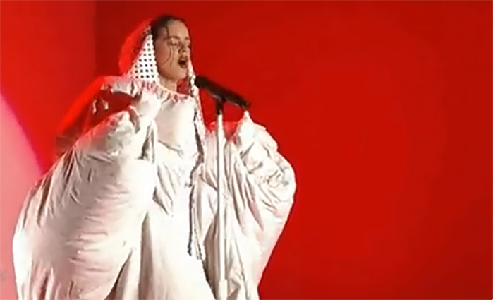 Todo poderío latino, su segunda actuación se vistió de rojo. Sobre un escenario de plataforma carmesí, Rosalía interpretó, cual virgen doliente, La Fama, su canción con The Weeknd pero, en esta ocasión, sin The Weeknd. Aquí se abrieron dos bandos en las redes sociales, los que veían en la vestimenta de la española un edredón tocado sobre la cabeza por una alfombrilla de las que se ponen para no resbalar en el baño y los que se maravillaban del espectáculo.