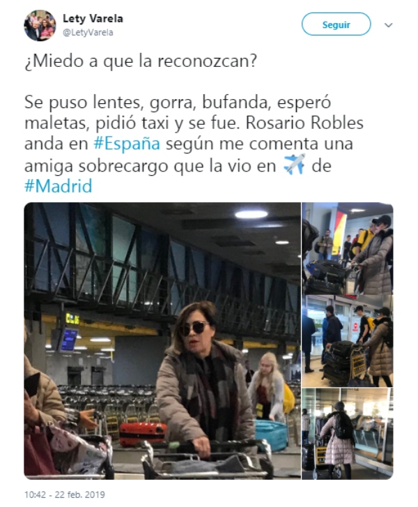 Rosario Robes Berlanga, exsecretaria de Desarrollo Agrario, Territorial y Urbano de México (Sedatu), fue captada en el aeropuerto de Madrid, España. Portaba lentes oscuros y una gorra, con lo cual daba la impresión de intentar estar de incógnita.