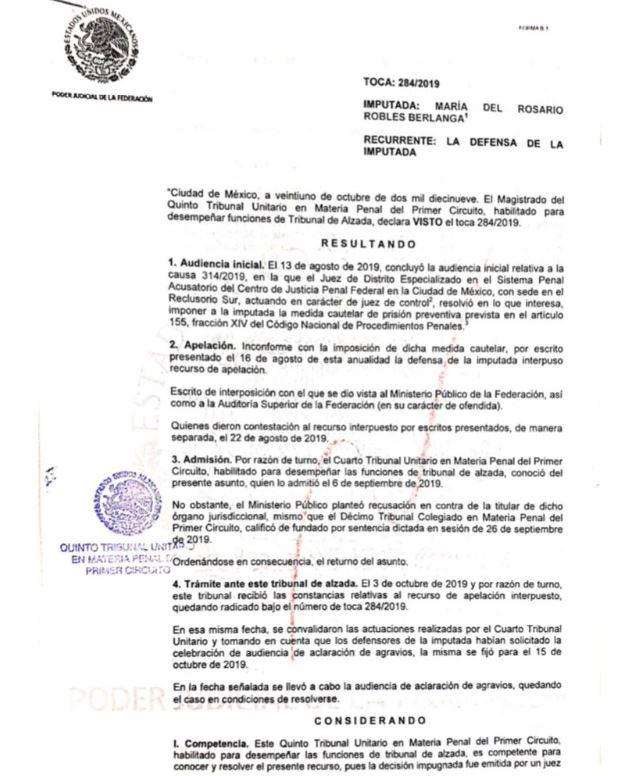 En un comunicado, la defensa de Robles expuso que “Ante la existencia de irregularidades, errores y violaciones al procedimiento en el que se dictó la prisión preventiva como medida cautelar en contra de Rosario Robles Berlanga, el titular de 5to Tribunal Unitario en Materia Penal, Ricardo Paredes Calderón, ordenó la reposición del mismo para revisar de manera minuciosa y apegada a derecho las decisiones tomadas por el Juez Felipe de Jesús Delgadillo Padierna”.
