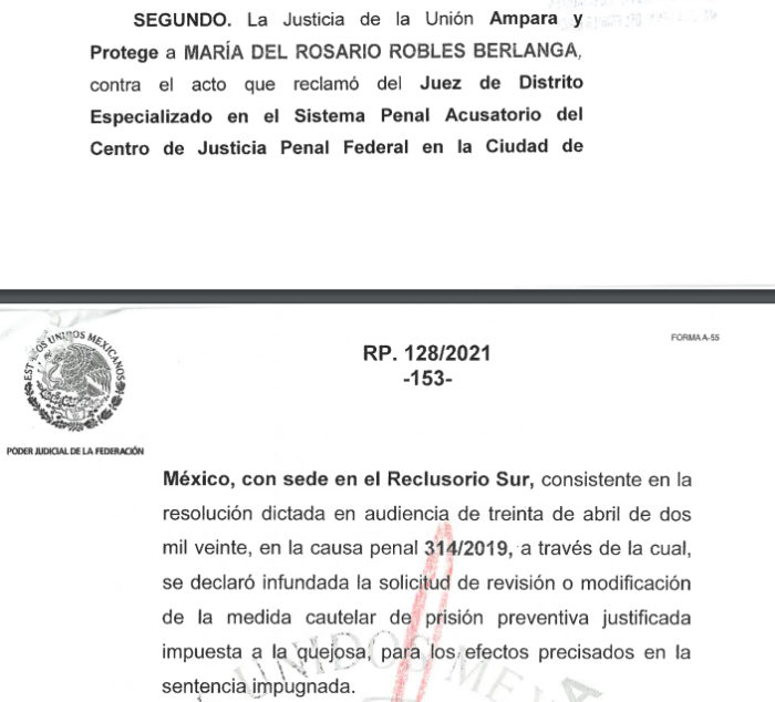“Como consecuencia de lo así razonado, con atingencia jurídica la juez recurrida determinó conceder el amparo a la quejosa María del Rosario Robles Berlanga”, enuncia el oficio.