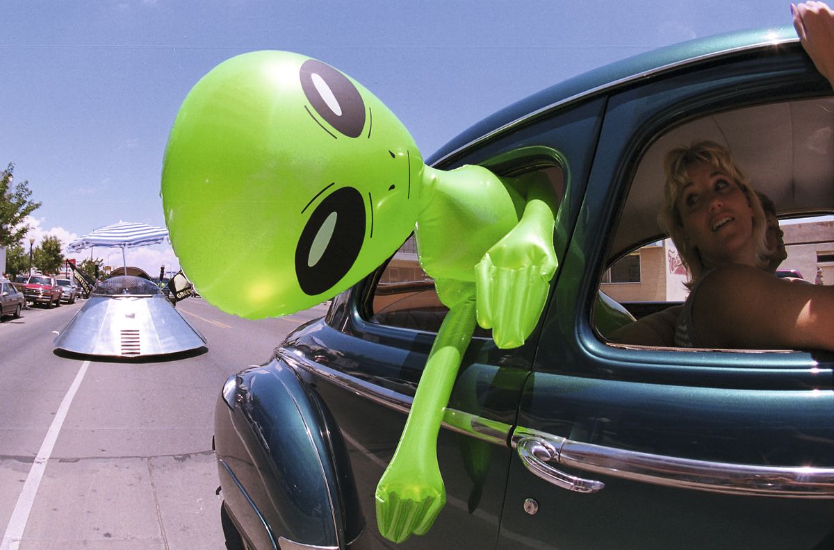 Roswell, una ciudad en medio del desierto de Nuevo México, parece sacada de una película de ciencia ficción. No es una metáfora. Quien pase por ahí, por unos minutos aunque sea, puede ver casi cualquier cosa con una estampa ovni incorporada. Hay farolas con cabezas de extraterrestres, carteles publicitarios decorados con naves espaciales, tiendas de todos los tamaños llenas de objetos de temática espacial u hoteles con fachadas decoradas con alienígenas. El McDonald’s que no falta en ninguna ciudad de Estados Unidos, tiene forma de platillo volante, es de color plateado y está rodeado de luces de neón que se iluminan por la noche.