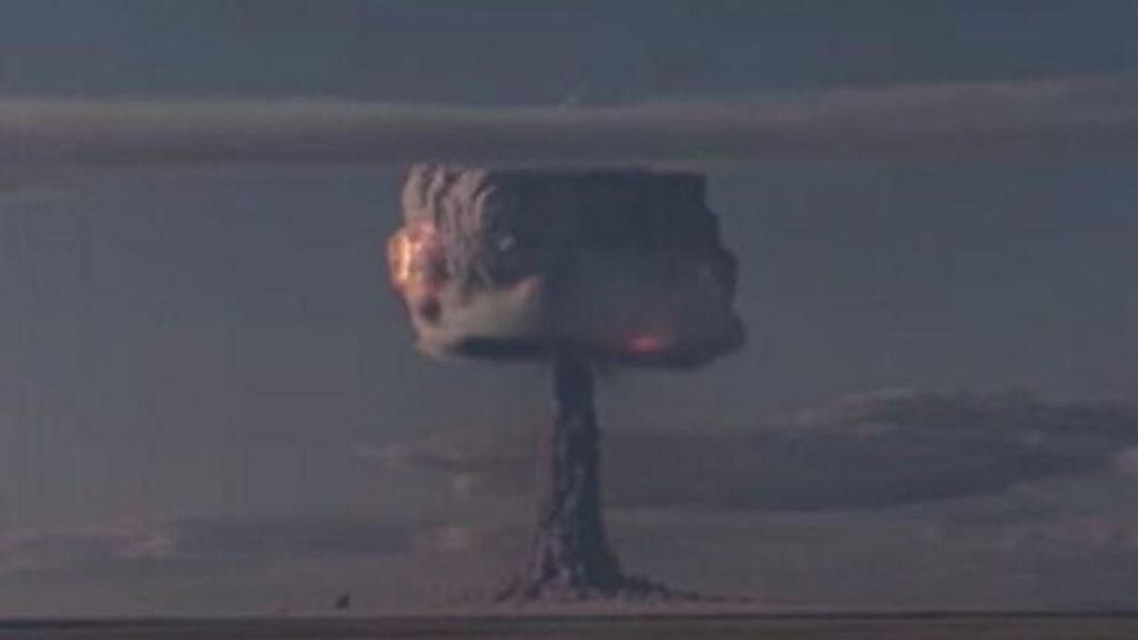 En otras palabras, la «bomba del Zar» fue 3.333 veces más destructiva que la bomba de Hiroshima. Desde varios ángulos y distancias, el impresionante video muestra como se forma y desarrolla una nube gigante con forma de hongo (que llegó a alcanzar los 60 km de altura) una vez la bomba ha sido detonada.