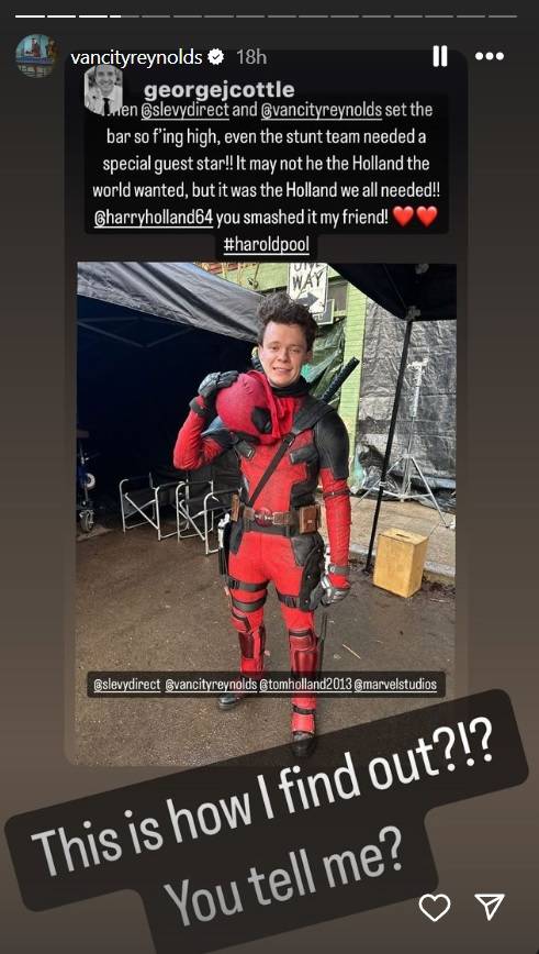 Tras la noticia de que el hermano de Tom Holland, Harry Holland, era una de las variantes de Deadpool, apodado Haroldpool en Deadpool y LobeznoResulta que el propio Wade Wilson no tenía ni idea de que este cameo hubiera sucedido. Cuando Reynolds volvió a compartir la noticia a través de sus historias de Instagram, dio la siguiente reacción:
