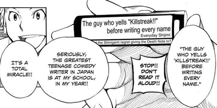 Cuando Taiyo descubre la verdad, siendo la persona enormemente entusiasta que es, comienza a bromear e inmediatamente procede a compartir sus chistes favoritos de Everyday Shijimi, incluido el que hace referencia a Aviso de muerte: “¿A quién se arrepintió el Shinigami de haberle dado el Death Note? El tipo que grita ‘Killstreak !!’ antes de escribir todos los nombres. “Aunque fue un momento relativamente corto, los lectores que empezaron a leer Show-ha Shoten! porque Aviso de muerte El artista Takeshi Obata está ilustrando la serie. Show-ha Shoten! no comparte nada en común con Aviso de muerte contextualmente.