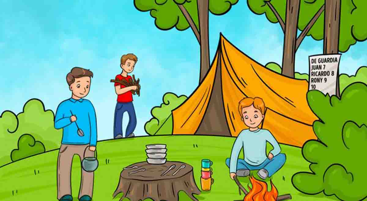 Cada una de las tres personas está realizando una actividad: recoger leña, cocinar y mantener el fuego encendido. Además, vemos un cartel en un árbol que dice lo siguiente: «De Guardia. Juan 7, Ricardo 8, Rony 9, 10».